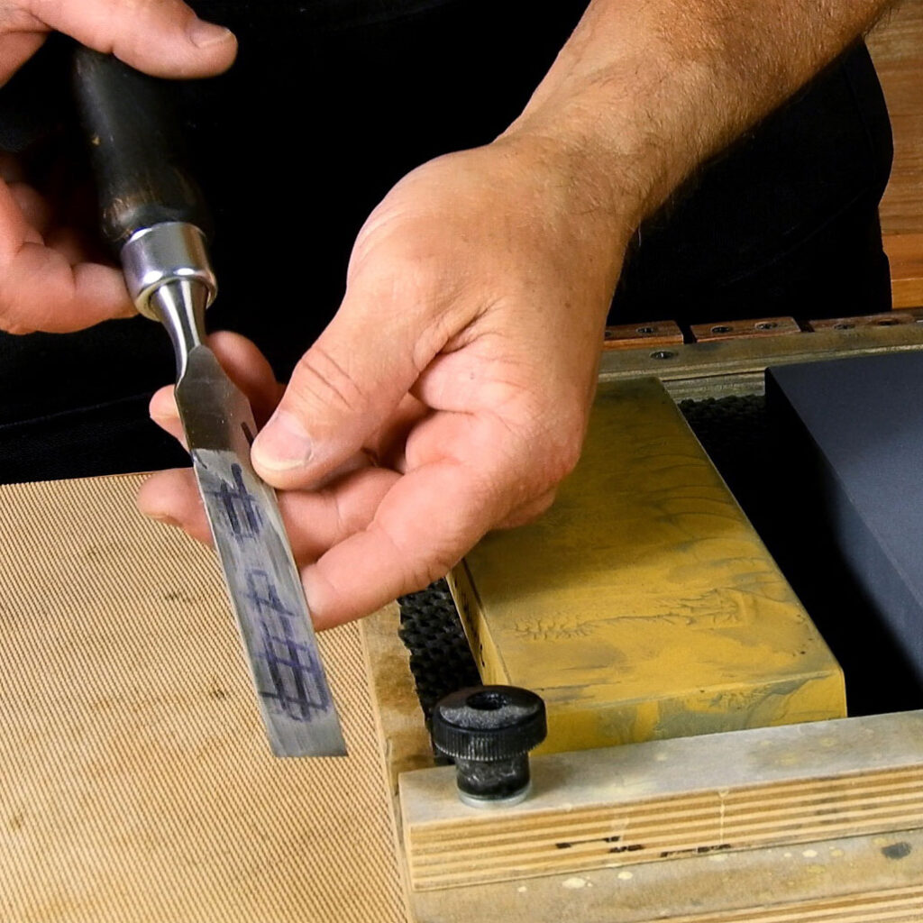 För att slipa den primära fasningen, montera bladet ordentligt i slipguiden och arbeta dig upp genom kornstorlekarna från grovt till fint. När du är klar med den finaste kornstorleken polerar du baksidan på den finaste stenen för att ta bort graderna. För att skapa en sekundär fasning, om så önskas, ökar du vinkeln något och gör några pass på den finaste stenen. Polera verktygets baksida igen på samma sten för att ta bort eventuella grader och verktyget är redo att användas.